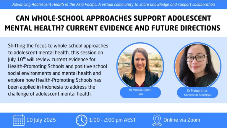 Shifting the focus to whole-school approaches to adolescent mental health, part 2 of this series on July 10th will review current evidence for Health-Promoting Schools and positive school social environments and mental health and explore how Health-Promoting Schools has been applied in Indonesia to address the challenge of adolescent mental health.